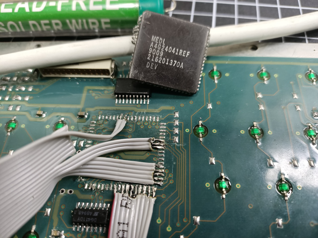 Removing the custom PLCC 68, replacing the relevant row/column pins with a ribbon cable.